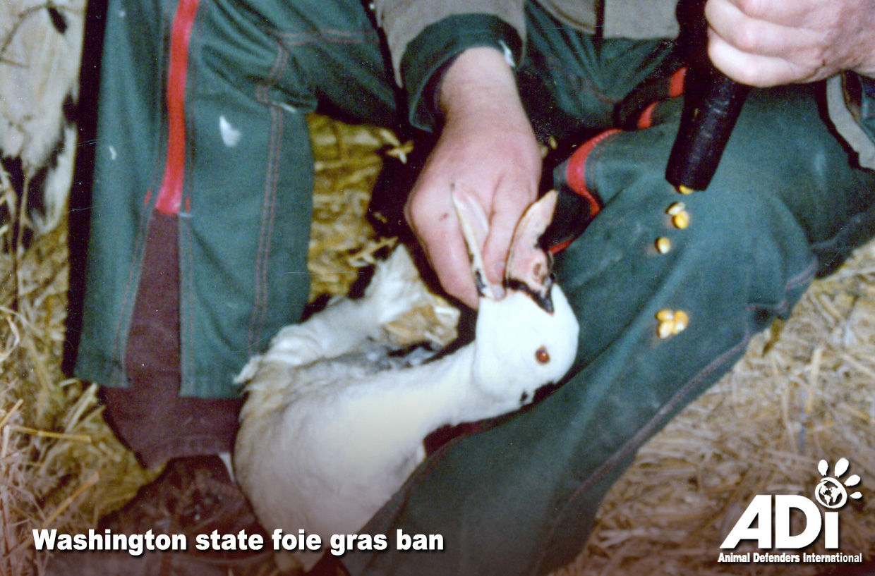 Washington State has reintroduced a bill to prohibit force feeding birds for foie gras and selling foie gras. Foie gras is one of the cruelest farming practices, with ducks and geese force-fed huge amounts of grain several times a day, causing their livers to swell up and become sick and distended. Once their livers reach twice the normal size and more than 10 times normal weight, they are killed. Immense suffering for a so-called luxury product made from a bird’s diseased, fatty liver.