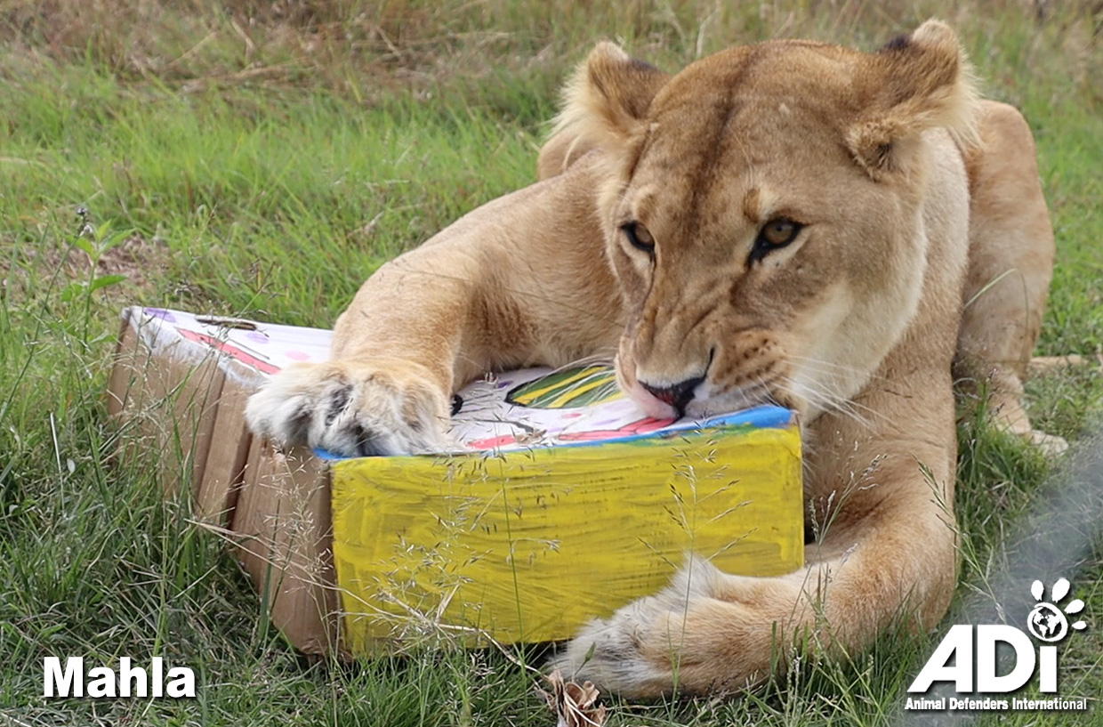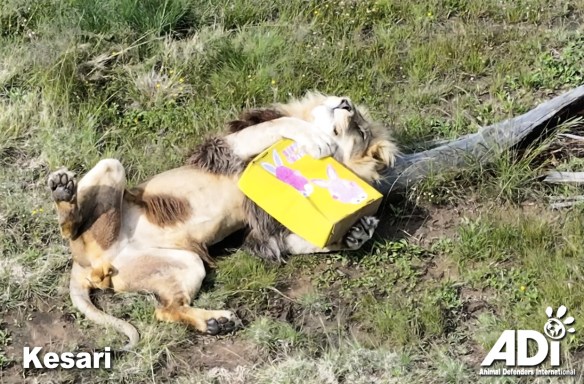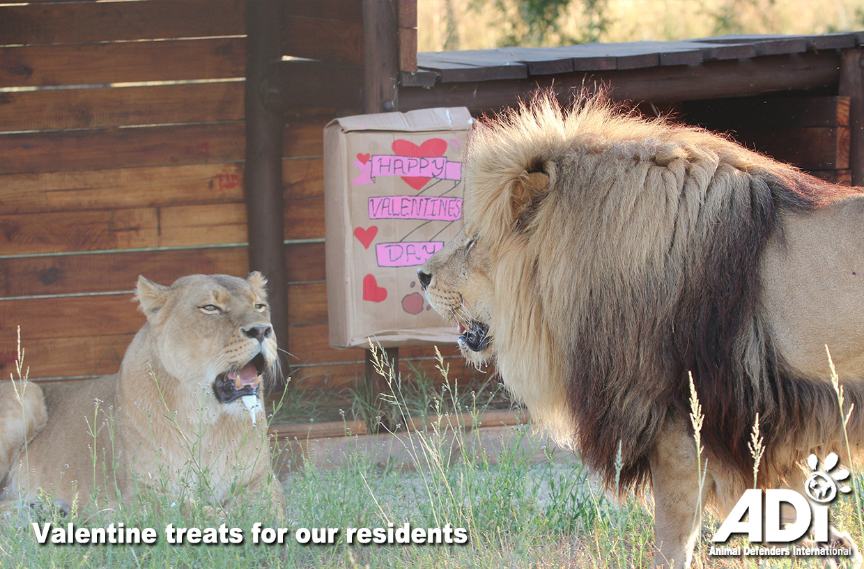 Watch (or watch again!) our ADIWS residents, saved from circuses, the illegal pet trade, and wildlife traffickers, receiving some extra love this Valentine’s. Fun-loving treats enjoyed by our lions and tigers included boxes filled with catnip, lavender, perfume, and even donkey droppings! Coralie and Goliath enjoyed their first Valentine’s Day at the Sanctuary and only had eyes for one another.