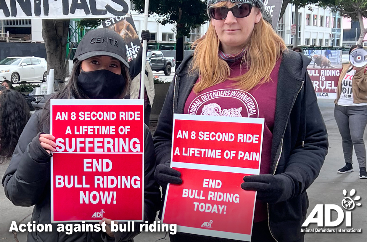 ADI joined the protest at the Professional Bull Riders’ ‘SoCal Showdown’ competition in Los Angeles. Animals are routinely prodded, whipped, and electric shocked for this cruel sport, and can suffer debilitating injuries. We have been backing an LA ban on cruel rodeo devices being considered by LA City Council. Please urge the venue Crypto Arena not to host bull riding and other events using animals. Email guestservices@cryptoarena.com. If you live in Los Angeles, please leave a comment in support of the LA City rodeo device ban.