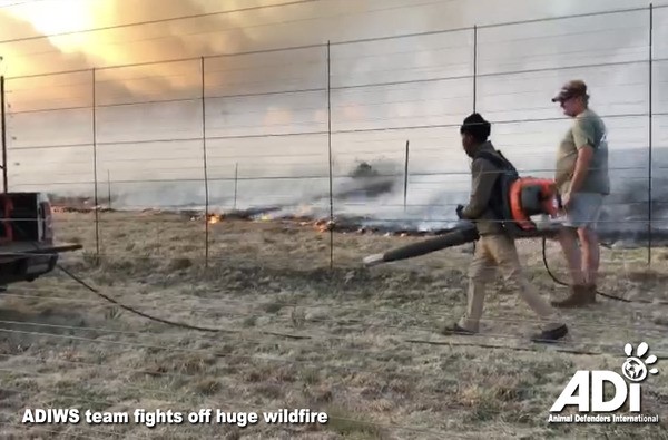 Last weekend, high winds drove high-speed wildfires across Free State, South Africa. We received an alert about a fast-moving fire 25 miles away; the team geared up, firefighters were loaded, and the lions and tigers were brought into their safe zones. In the next hours, despite all efforts to stop it, the huge fire raced along the road towards us. Briefly, it looked like it would pass us by, but the wind turned it and at 3:40pm our north field (outside the security fence) was on fire and the fire was also approaching our west border. The team split to fight the fire on both sides, pushing it back while soaking our interior border. It was extinguished at 6pm without entering the sanctuary. All animals were safe, and three tortoises found in danger outside, have started new lives at ADIWS. We are appealing for funds to install a perimeter sprinkler system here.