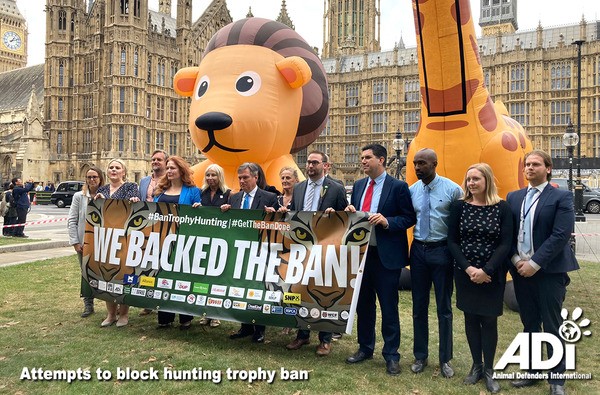 In a blatant attempt to force the UK Hunting Trophies (Import Prohibition) Bill out of time, a small group of pro-hunting peers tabled a raft of amendments during the Committee Stage in the House of Lords. They refused to have these grouped for discussion, stalling for time by giving extended speeches supporting trophy hunting. The end of this parliamentary session is just weeks away, and the bill is now unlikely to pass. The day after the bill’s fated hearing, ADI and members of the Coalition Against Trophy Hunting stood outside Parliament with supportive Peers and MPs to urge the Government to fulfil its promise of a ban four years ago.