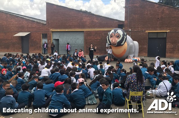 Our inflatable owl monkey continues to tour Colombia, meeting 400 schoolchildren from INEM Santiago Pérez public school, Bogotá. ADI’s Yani Mateus spoke about the natural behavior of wild owl monkeys and their treatment in laboratories. The school’s Animalist Children’s Club was created over ten years ago.