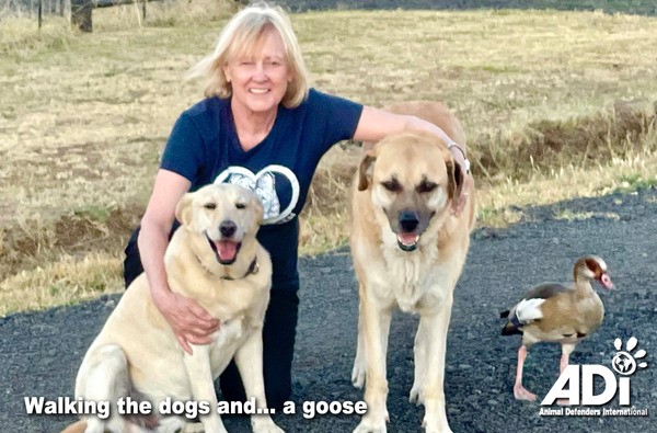New arrivals: ADIWS dogs Rollo and Milo have a new friend joining their walks, Harold the Egyptian goose! Harold arrived at ADIWS with two rescued Pomeranian geese (Hoighty and Toighty). Harold has become Rollo’s friend, grooming him, and joining the dogs on their walks – part flying and part walking alongside. The dogs watch over our rescued ducks, chickens, turkey, and guinea fowl living around the Chris Lee Lodge gardens. Other newcomers include four tortoises rescued from the illegal wildlife trade. The ADI family is growing!