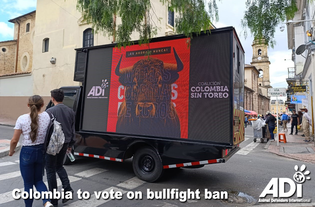 Colombia’s bullfighting ban on a knife edge. Despite hours of debate in the House of Representatives this week, the historic Bill 219/23C to ban bullfighting has yet to go to a vote. The ban will be back on the agenda on May 14. As well as lobbying, ADI has sponsored mobile digital billboards to tour Bogota, showing footage from bull fights and giving people the facts on the suffering of the bulls and horses. Despite public support for a ban, the powerful bullfighting lobby continues to pull out all the stops to block the bill. Support the Colombia Sin Toreo campaign