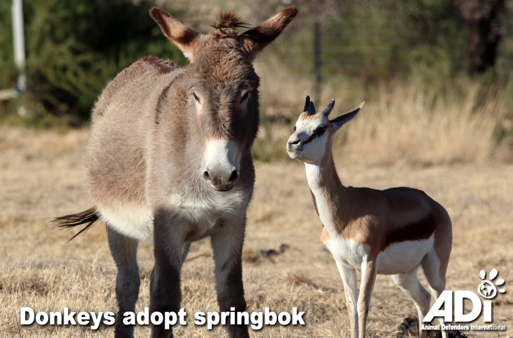 Our family of rescued donkeys that roam the ADI Wildlife Sanctuary recently took in a young springbok who was rescued after being injured and chased to exhaustion by hunters with dogs. We had expected her to join the other antelope, instead she joined our family of donkeys, and on cold nights the adult donkeys gather around her and the infant donkeys to keep them warm.