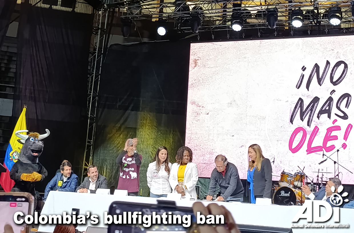 Over 1,000 people, including members of Congress, watched Colombia’s President Gustavo Petro sign Colombia’s bullfighting ban into law at a celebration with music and speeches in Bogota’s bullring. ADI and Colombia Sin Toreo presented President Petro with an award recognizing his commitment to end the suffering. The ban will come into force in three years and will face challenges from the bullfighting lobby. Please help ADI keep working to protect the ban.