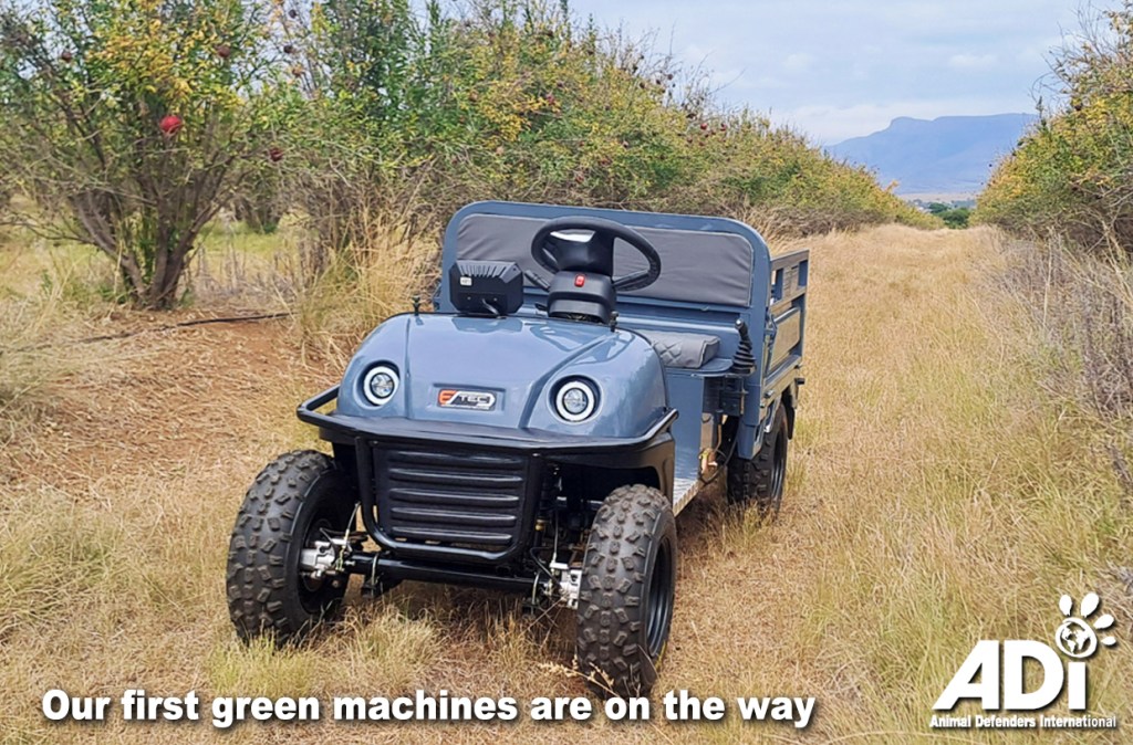 YOU DID IT! OUR FIRST TWO GREEN MACHINES HAVE BEEN ORDERED: A huge thank you to everyone who contributed towards fully electric Blitz Cruisers to work on the sanctuary. We purchased the first two and are continuing to raise funds to complete our fleet of four! These will really increase mobility on the sanctuary making all of our operations from feeding to repairs more efficient, enabling us to do more for the animals, and keep us moving towards our goal of a sustainable, eco-friendly sanctuary. These green machines will be quiet around the animals, free of emissions, and free to fuel (self-charging with a solar panel roof or charged through the sanctuary’s own solar power station. You can continue donating for the final cruisers here UK I US