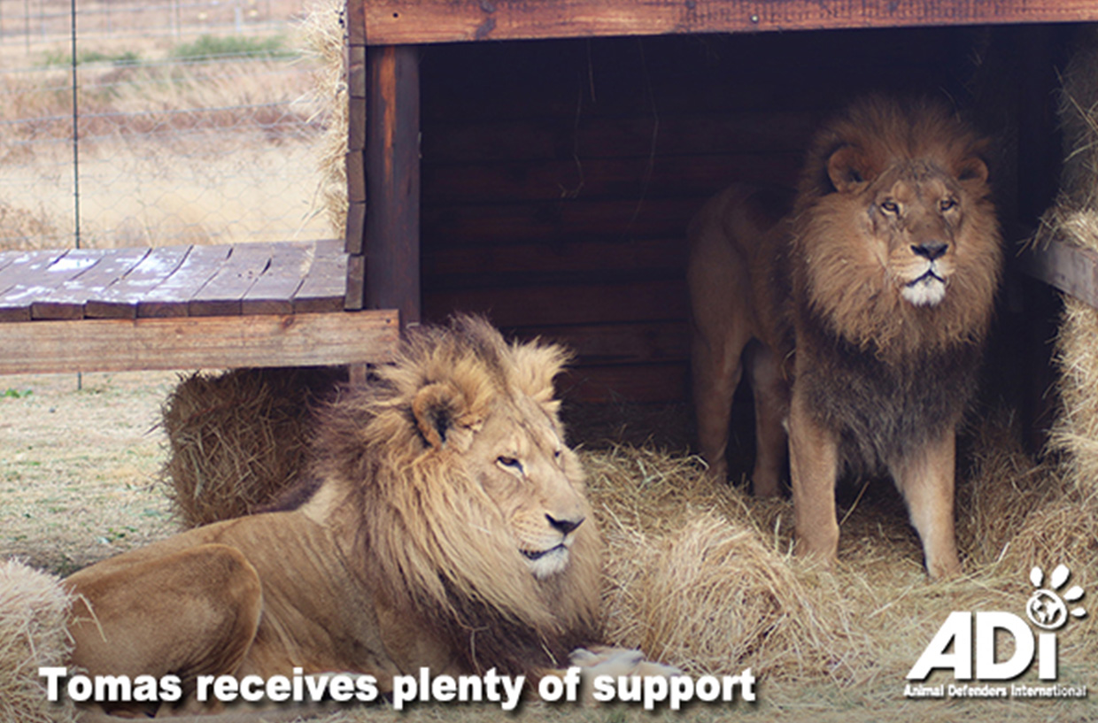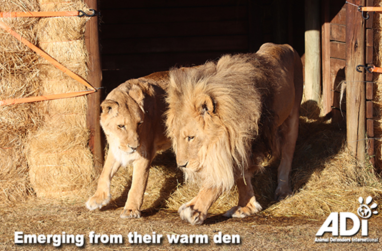 Lovebirds Tanya and Tarzan have been spending time together in their heated outdoor den at the Sanctuary, as Tarzan battles severe osteo-arthritis. It’s winter in the southern hemisphere, and July is the coldest month of the year in South Africa. We recently adapted the couple’s favorite sleeping place, installing a raised floor, extra insulation, and a heat pad for extra warmth. We are working to keep Tarzan’s weight up, and he is hand-fed either with tongs, or his food is placed on a raised table to take the pressure off his neck, shoulders, and spine. Dr. Caldwell has been monitoring and adapting Tarzan’s medication and is happy with his progress.
